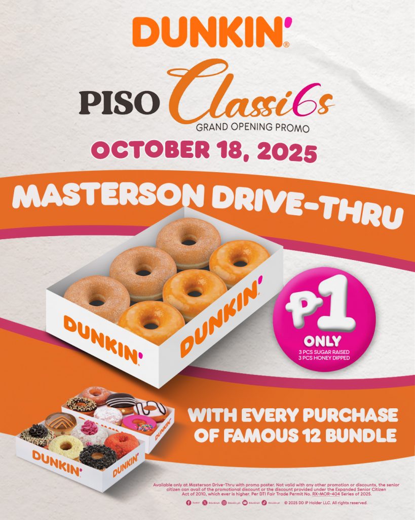 - Get 6 Classic Donuts (3 Sugar Raised + 3 Honey Dipped) for only ₱1 with every purchase of a Famous 12 Bundle.