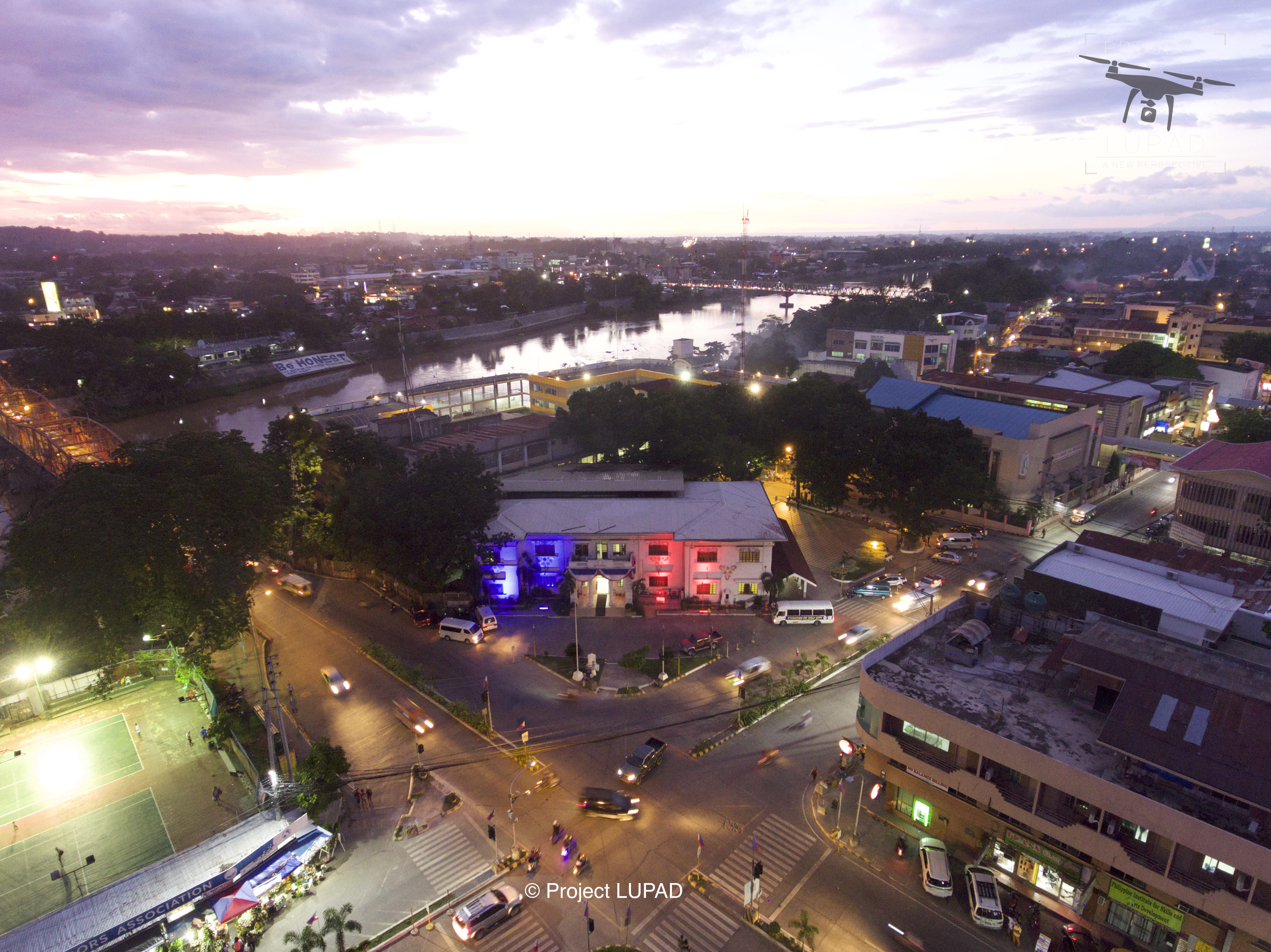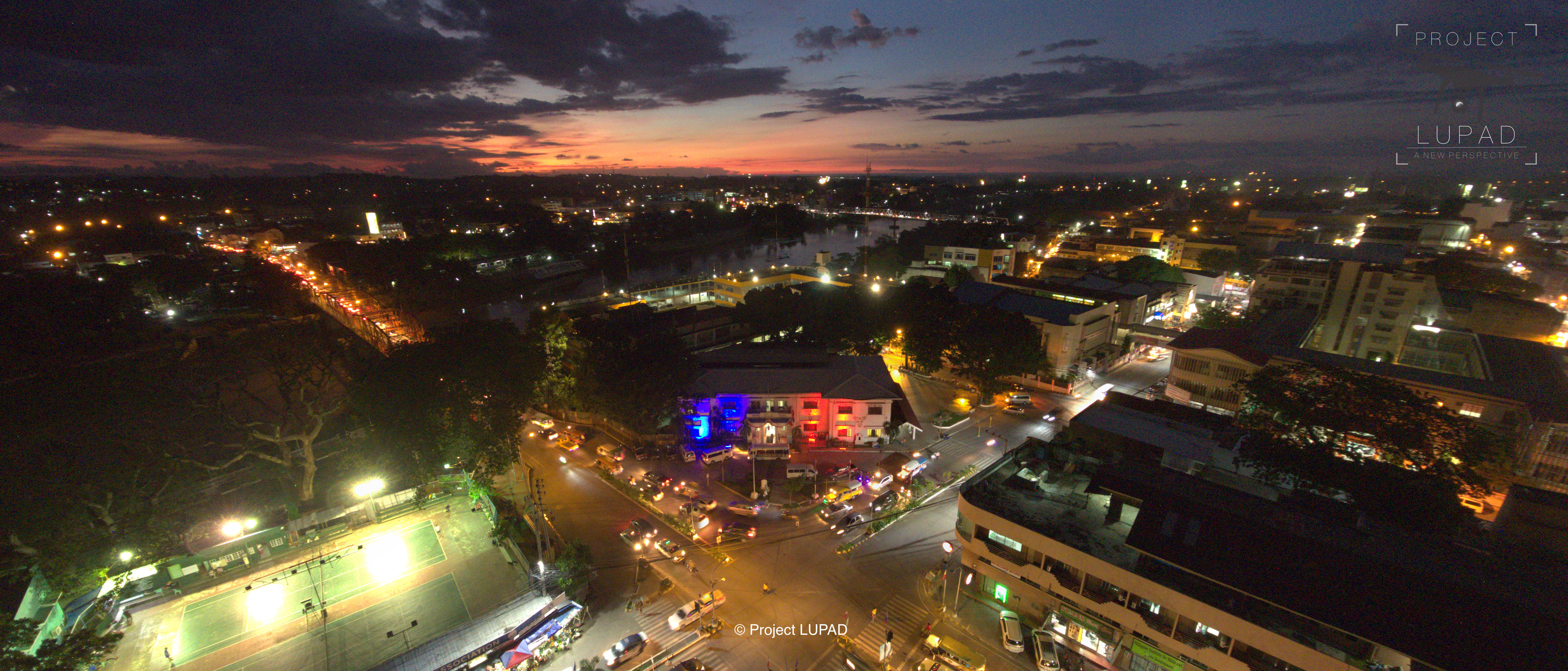 Dusk to dark aerial look of Cagayan de Oro’s City Hall District. Lights outside the City Hall are in blue, red and yellow in between, which signifies the Philippine flag.